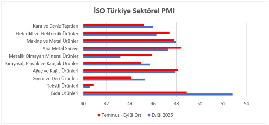 İstanbul Sanayi Odası tarafından açıklanan Satın Alma Yöneticileri Endeksi (PMI) verileri de sanayi tarafında işlerin oldukça olumsuz seyrettiğini gösteriyor. Yılın ikinci yarısı, temmuz–eylül dönemine ilişkin ortalama PMI verileri, tüm alt sektörlerde eşik değer olan 50’nin altında kaldı. Eylül ayında ise yalnızca gıda ürünleri sektörü eşik değer 50’nin üzerine çıktı. Elektrik-elektronik, ana metal, metalik olmayan mineral ürünler ve tekstil sektörlerinde ise eylül verileri, yılın ikinci yarısına ait ortalamanın da altında kaldı.