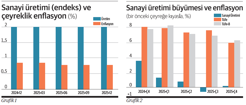 Salı günü 2025’in tümünün sanayi üretim gerçekleşmesini öğrendik. ‘Kuru’ değerler şöyle: 2025’te bir yıl öncesine kıyasla sanayi üretimi yüzde 2,6 arttı. Frekansı artırıp çeyrek dönemlik değişime bakınca ise dördüncü çeyrekte bir önceki çeyreğe kıyasla artışın yüzde 0,1 olduğu anlaşılıyor.