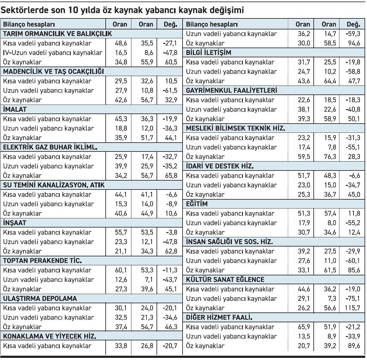 • Sektörlerde öz kaynak oranı artışı, tersinden yabancı kaynak oranının düşmesi anlamına geliyor. Uzun vadeli yabancı kaynaklar bütün sektörlerde gerilerken, kısa vadeli yabancı kaynaklar sadece eğitim sektörü”nde yüzde 11,8’lik artış göstermiş.