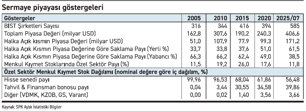 Ülkemizde finansal tasarrufların son derece kısıtlı olduğunu biliyoruz. Geleneksel olarak, tasarruf sahiplerinin tercihinin çok büyük ölçüde mevduattan yana olduğu da yadsınamaz bir gerçek. Henüz arzu edilen büyüklükte olmayan sermaye piyasasında ise yatırımcı tercihlerinin, daha çok kamu sektörü borçlanma araçlarına yönelik olduğunu görüyoruz. Tablo 1’de, halka açık şirket sayısı, dolar bazında piyasa kapitalizasyonu ve özel sektör borçlanma aracı ihraçlarında, özellikle son 10 yılda artış izleniyor olsa da, özel sektör menkul kıymetleri, her dönemde kamu borçlanma araçlarının çok gerisinde kalmaya devam ediyor.
