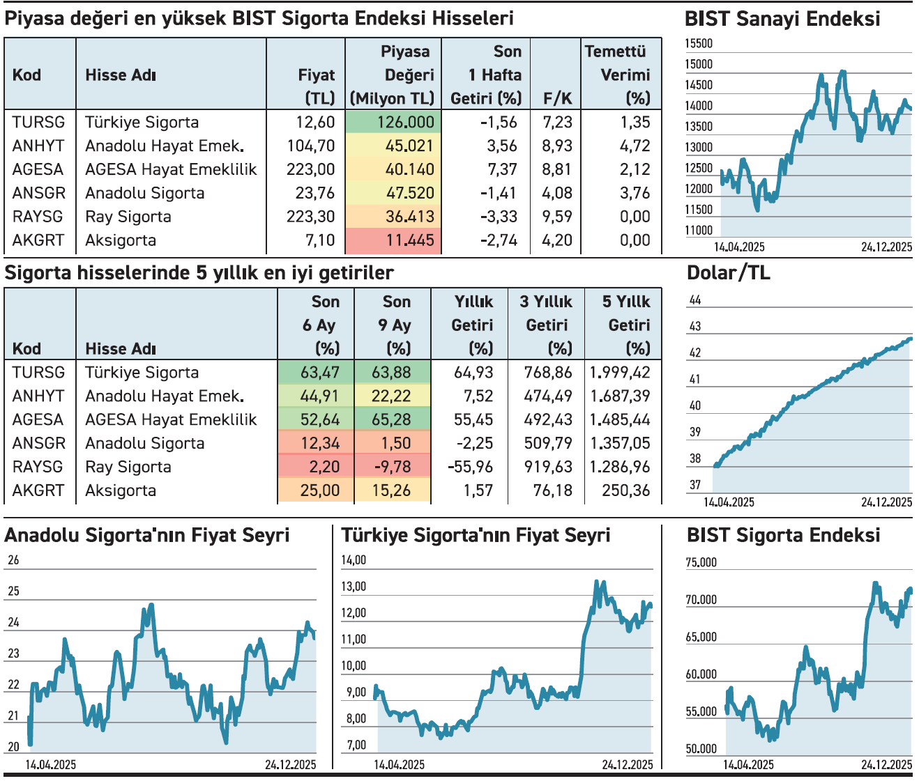 BIST Sigorta Endeksi, son altı ayda %36,85 artış kaydetti. Aynı süre içinde sektördeki hisseler de olumlu bir performans sergiledi ve fiyatlar kayıpsız görüntüyle öne çıktı. Endeks kapsamında 6 hisse bulunurken üçü %44’ün üzerinde yükselişle diğerlerinden farklılaştı. En yüksek getiriye sahip olan %63’ün üzerinde prim yaptı ve ulaştığı piyasa değeriyle de dikkat çekti. Buna karşılık en geride kalanın artışı %2’yi ancak aşabilirken zayıf bir görüntü sergiledi. Türkiye Sigorta, son altı ayda %63 yükselişle sigorta sektöründe açık ara en iyi getiriyi gerçekleştirdi. Dokuz aylık dönemde prim üretimini %45 ve net primlerini %53 büyüten şirket, dönem sonunda kârını %49 artırdı. Şirket, aynı zamanda 125 milyar TL piyasa değeriyle sektörün en büyük firması konumunda bulunuyor. Fiyatı ise ekimden bu yana oldukça hareketli. Agesa Hayat Emeklilik, %53 getiri ile sektörde en fazla artış kaydeden ikinci firma konumunda. Nisandan bu yana yükselen bir seyir izliyor. Geçen süre zarfında 126 TL bölgesinden hareket ederek mevcut seviyelere geldi. Son bir ayda fonlardan ağırlıklı olarak satış yönlü işlemler gelse de 200 TL’nin üzerinde hareket ediyor. Getirisi zayıf kalan Ray Sigorta altı aylık dönemde sadece %2,2 yükseliş kaydetti. Ocak 2025’te en yüksek 800 TL’ye kadar çıkan fiyatı sonrasında sürekli geriledi. Marttan bu yana oluşan tabanda dalgalı bir seyir izliyor.