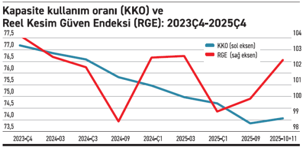 Yılın son çeyreğine ilişkin reel sektördeki gidişat açısından fikir verebilecek üç değişkene ilişkin güncel bilgimiz mevcut. Kapasite kullanım oranı, reel kesim güven endeksi ve reel kredi faizleri. Dün, ilk ikisi için kasım değerleri açıklandı. Kredi faizindeki gelişmeleri ise haftalık olarak biliyoruz. Sanayi üretiminin dönemsel büyüme oranı 2024’ün son çeyreği ile bu yılın üçüncü çeyreği arasında hep aşağıya doğru bir eğilim izledi. Elimizdeki son veri üçüncü çeyreğe ait ve bir dönem öncesine kıyasla daralma gösteriyor. Kapasite kullanım oranında sanayi üretimine paralel bir seyir gözlendi. O da aynı dönemde hep aşağıya doğru gitti. Ancak son üç aydır hafif de olsa artış var. Bu üç ayın son iki ayı dördüncü çeyreğe ait. Benzer bir eğilim reel kesim güven endeksinde de gözleniyor. Yılın başından beri yükseliyor. Gerçi bu iki verinin seyri birbirlerinden ayrışabiliyorlar ama son aylarda her ikisi de yükseliyor.