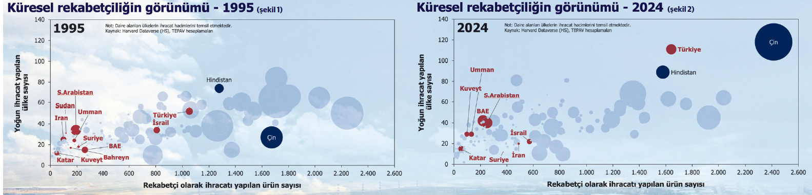 Çin, 1995 yılında 1700 civarında ürünü 20-25 civarında ülkeye satarken, 2024’te 2400 civarında ürünü, 120 civarında ülkeye satabilmeye başladı. Hindistan ise 1200 civarında üründen 1700 civarında ürüne çıktı, satış yaptığı ülke sayısını da 80’lerden 100’lere çıkardı.