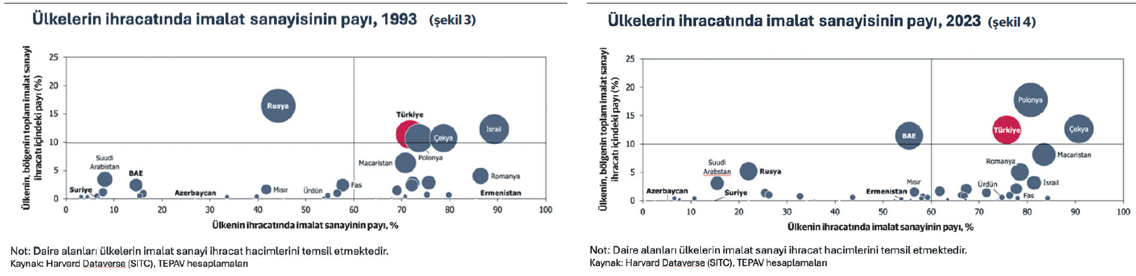 2023’e gelindiğinde ise Türkiye’nin toplam ihracatının yüzde 75’i imalat sanayii ürünlerinden oluşuyordu. Ve bu performansla bölgemizin toplam imalat sanayii ihracatının yüzde 15’ini Türkiye üstlenmişti.