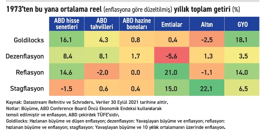 Schroders’in hazırladığı analizin başlığı şöyleydi: “Stagflasyonist ekonomik ortamlarda altının getirisi diğer finansal enstrümanlara kıyasla açık ara birinci sırada olmaktadır.”