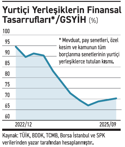 Finansal tasarruflar sadece sistemdeki kalemleri içeriyor. Yani içinde yastık altı altın ve döviz ya da dijital paralara yapılan “yatırımlar” yok. Kısaca veriyi ülkemizde finans sektörü kurulduğundan bu yana (yaklaşık 160 yıl) geçen sürede, biriktirdiğimiz tüm tasarrufların bir yıllık gelirimize oranı olarak okuyabilirsiniz. Bu oran Aralık 2022 itibariyle yüzde 95 civarında iken, 2023 ve 2024 yıllarında düzenli bir şekilde gerileyerek, 2024 sonunda yüzde 67 olmuş. 2025 içinde ise hafifçe artarak yüzde 70 civarına gelmiş.