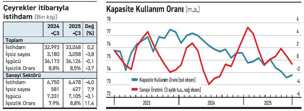 Yeni açıklanan veriler, yaşanan kırılmayı tartışmasız şekilde görünür kılıyor. 2025 yılının 3. çeyreğinde sanayi üretimi, mevsim ve takvim etkisinden arındırılmış olarak bir önceki çeyreğe göre %0,6 daraldı. Üç aylık hareketli ortalamalar, üretimin yılın ikinci yarısında yerinde saydığını gösteriyor. Kapasite kullanım oranı da 73,8 ile Covid sonrası dönemin en düşük seviyelerine geriledi. Şubat 2023’ten bu yana süren düşüş trendi artık kronikleşmiş durumda.
