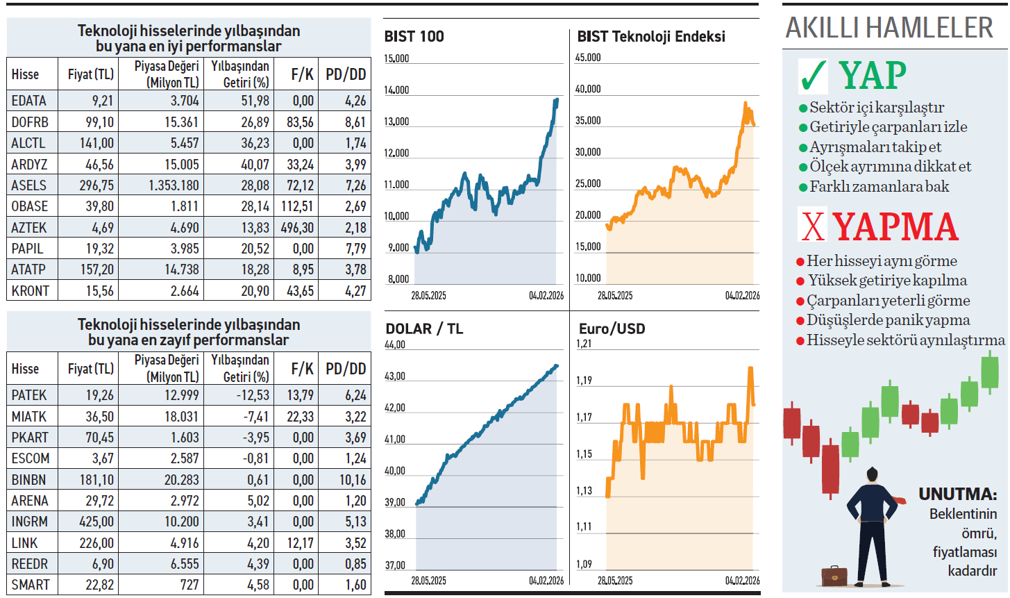 Borsada ortalamalar en yanıltıcı istatistiklerdir. Uzaktan bakıldığında teknoloji sektörü topyekûn borsanın üzerinde bir performans sergilediği sanılabilir. Gerçekteyse E-Data ve Aselsan gibi sadece 6 hisse endeksi yukarı taşıdı. Sektördeki 29 hisse, BIST 100’ün altında getiri sağlarken 4 hisse de kaybettirdi. Hisselerin ağırlığının piyasa ortalamasının gerisinde kalmasıysa tesadüf değil. Paranın özellikle hikayesi en güçlü olana aktığı bir süreçten geçiliyor. Bu nedenledir ki endeksi satın almak yetmiyor. Ayrıca kalabalığın içinde saklanan o 6 endeks üstü kazandıranı bulmak gerekiyor. Kalan gerisi daha çok istatistiki dolgu konumunda.