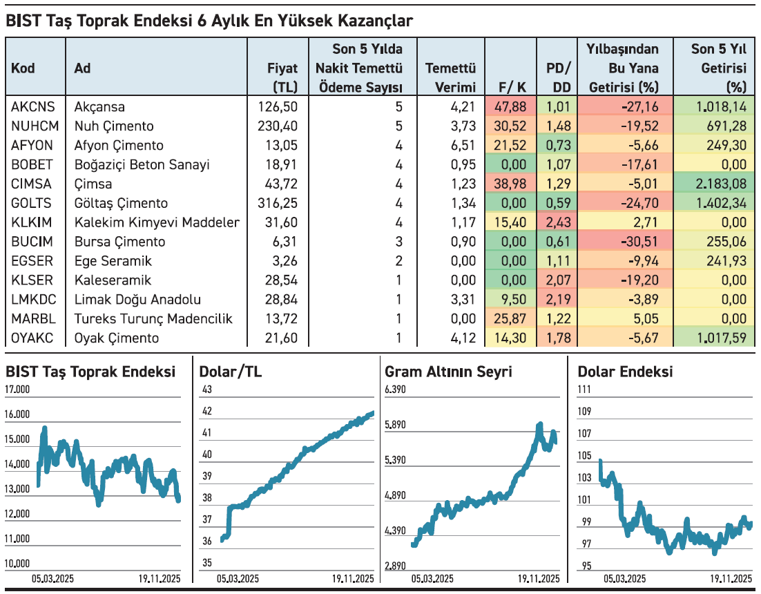 Çimsa, son beş yılda %2.183 yükseldi. Temettü ödeyen çimento firmaları arasında en fazla çıkan şirket, 1997’den 2018’e kadar düzenli kâr payı ödedi. Veri aranın ardından 2022’den itibaren tekrar düzenli temettüye döndü.