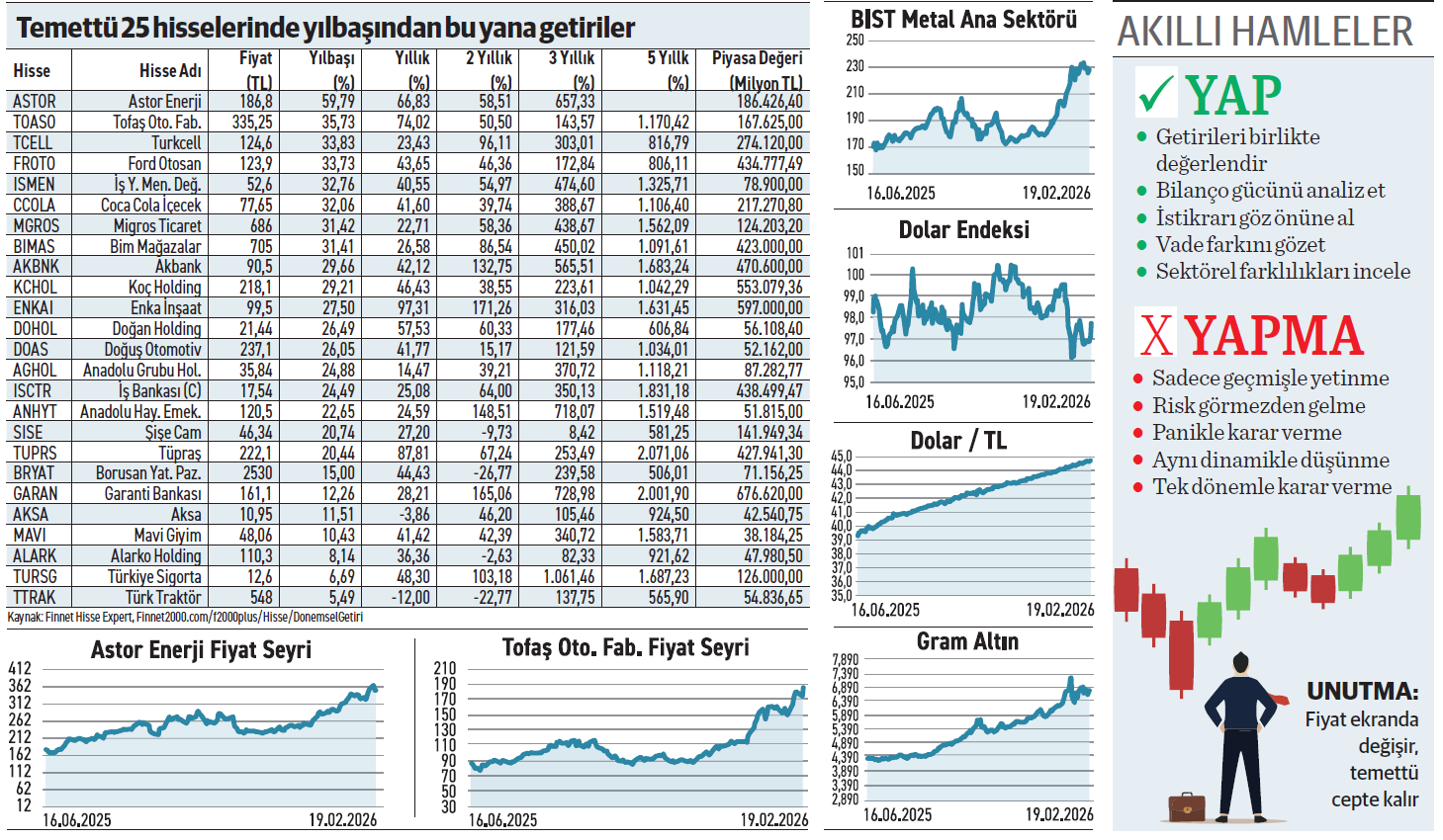 Yatırım dünyasının klişe tartışması büyüme mi, temettü mü sorusuna, yılbaşından bu yana borsa neden her ikisi de olmasın, diyor. En büyük 25 temettü hissesinden 11’inin endeksi geçmesi önemli bir mesaj niteliğinde. Astor Enerji'nin %50'yi aşan ve Ford Otosan'ın %38'e yaklaşan performansı; bu şirketlerin sadece kâr dağıtan durağan yapılar olmadığını, aynı zamanda büyüme hikayesi sunan dinamikler olduğunu söylüyor. Yatırımcı temettü için performanstan feragat etmediği gibi piyasanın büyüme hızını nakit güvencesiyle portföyüne taşıyor.