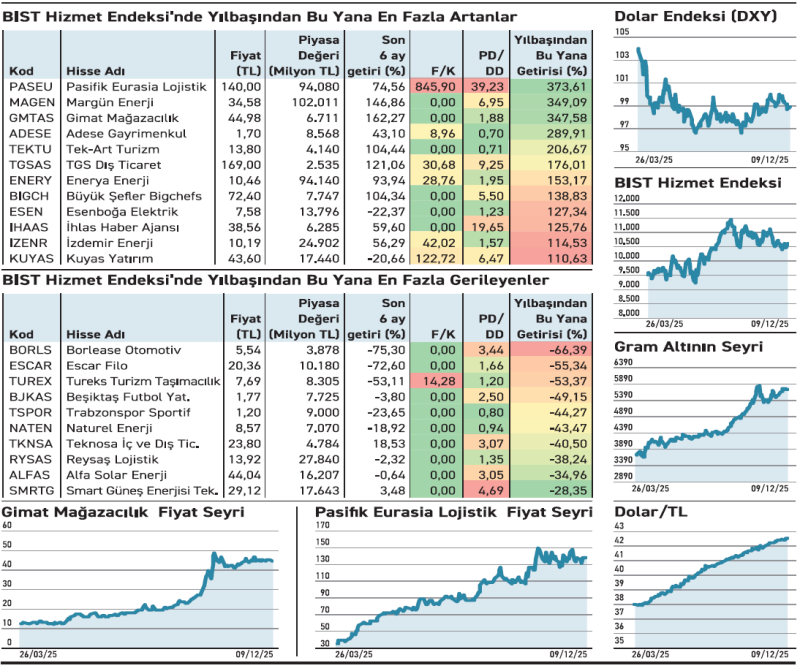 Borsa yılbaşından bu yana pozitif bir görünüm sergilerken hizmet sektörü bu ivmeden payını aldı. 130 hisseyi kapsayan BIST Hizmet Endeksi yıl başından bu yana %10,86 yükseldi. Endekste 12 hissenin getirisi %110’u aştı. Üç hisse %300’ün üzerine çıktı, biri ise %374’e ulaştı. Aynı sürede sektördeki 10 hissede kayıplar %30’u geçti ve bir hisse %66’ya varan değer kaybı yaşadı. Pasifik Eurasia Lojistik, yılbaşından bu yana %374’lük oranla BIST Hizmet Endeksi içinde en fazla yükselen şirket oldu. Haziran 2023’te borsaya gelen firma, geçen süre zarfında güçlü bir performans sergiledi. Demiryolu lojistiği alanında iddialı olan şirketin yöneticileri, Çin ile Avrupa arasındaki orta koridor üzerinden lojistik faaliyetlerinde ana oyuncu konumuna geldiklerini belirtiyorlar. Margün Enerji, %349 ile yılbaşından bu yana en fazla yükselen ikinci hisse konumunda. Özellikle yılın ikinci yarısından itibaren güçlü bir ivme sergiledi. Şimdilerde jeotermal enerji alanındaki yatırımlarıyla öne çıkıyor. Denizli ve Manisa’da yer alan, 9 adet Jeotermal Kaynak Ruhsatından ikisinin devrini tamamladı.