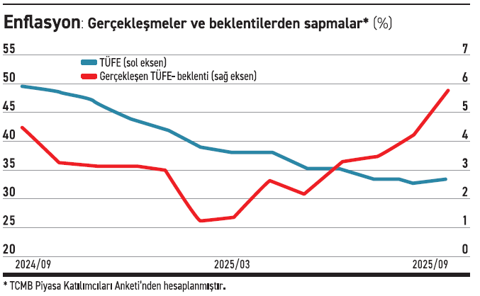 Göreceğiniz gibi Eylül 2024’den Mayıs 2025’e kadar TÜFE düzenli olarak gerilemiş. Beklentiler de bu dönemde gerçekleşen enflasyonu tahmin etmek konusunda oldukça başarılı. Mayıs 2025’ten sonra TÜFE’deki gerileme neredeyse duraklamış ama beklentiler TÜFE’deki gerilemenin devam edeceğini öngördüğü için gerçekleşmeden sapmaya başlamış. Eylül 2025’te bu “iyimser” sapma 6 puana yani enflasyonun yüzde 17’sine ulaşmış. Bu oldukça yüksek bir oran.