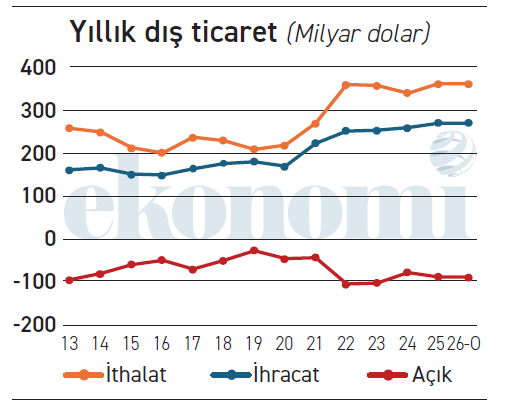 Yıllık ithalatta ise 2024 yılındaki düşüş dışında adeta yaprak kımıldamıyor. 2022 363,7 milyar, 2023 362 milyar, 2024 344 milyar, 2025 365,4 milyar, bu yılın ocak ayı 365,5 milyar.