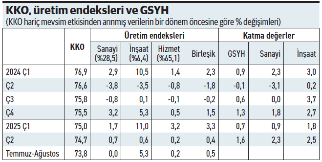 Tabloda çeyreklik dönemler için 2024’ün ilk çeyreğinden bu yana kapasite kullanım oranı (KKO), sanayi, üretim, inşaat üretim endekslerinin ve bunların ağırlıklı ortalaması olan birleşik üretim endeksinin bir dönem öncesine göre yüzde değişimleri gösteriliyor. KKO için 2025 üçüncü çeyrek verisi varken, üretim endeksleri için temmuz ile ağustos endeks değerlerinin ortalaması söz konusu. Birleşik endeks türetilirken, üç üretim endeksinin GSYH’deki paylarından türetilen ağırlıkları kullandım. Bunlar ilgili sütunlarda parantez içinde gösteriliyorlar. Tabloda ayrıca son üç sütunda GSYH ile GSYH’nin sanayi ve inşaat alt kalemlerinin bir çeyrek öncesine göre yüzde değişimleri de yer alıyor.