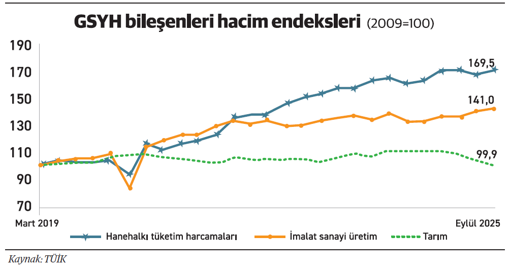 Şekil 1’deki grafikleri şöyle okumak gerekiyor: En üstteki daha koyu renkli hanehalkı tüketim harcamaları hacim endeksi, 2019’un ilk çeyreğinde 100 seviyesindeyken, 2025’in üçüncü çeyreğinde 169,5’e yükselmiş. Yani, hanehalkı tüketimi 6,5 yıllık dönemde reel bazda neredeyse %70 büyümüş. Muazzam bir artış. Merkez Bankası taleple ilgili endişe duymasında yerden göğe haklı. 2024 yılının sonundan itibaren iç talebin büyümesi yavaşlıyor olsa da hala kuvvetli bir iç taleple karşı karşıyayız.