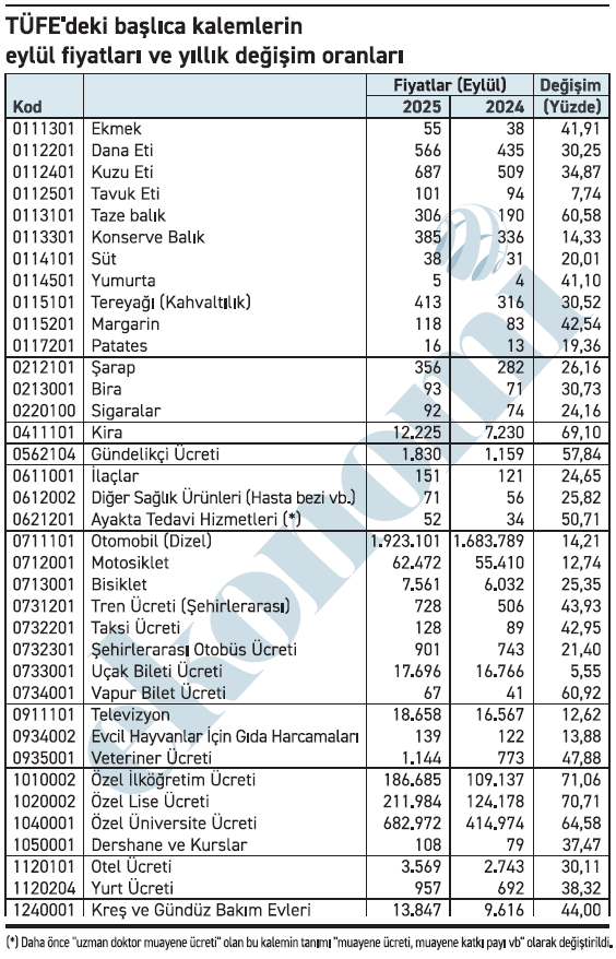 Gelin şimdi eylül ayında başlıca kalemlerde hangi fiyatlar dikkate alınarak hesaplama yapılmış ve bu kalemlerde son bir yıldaki fiyat değişimi ne olmuş, ona bakalım...