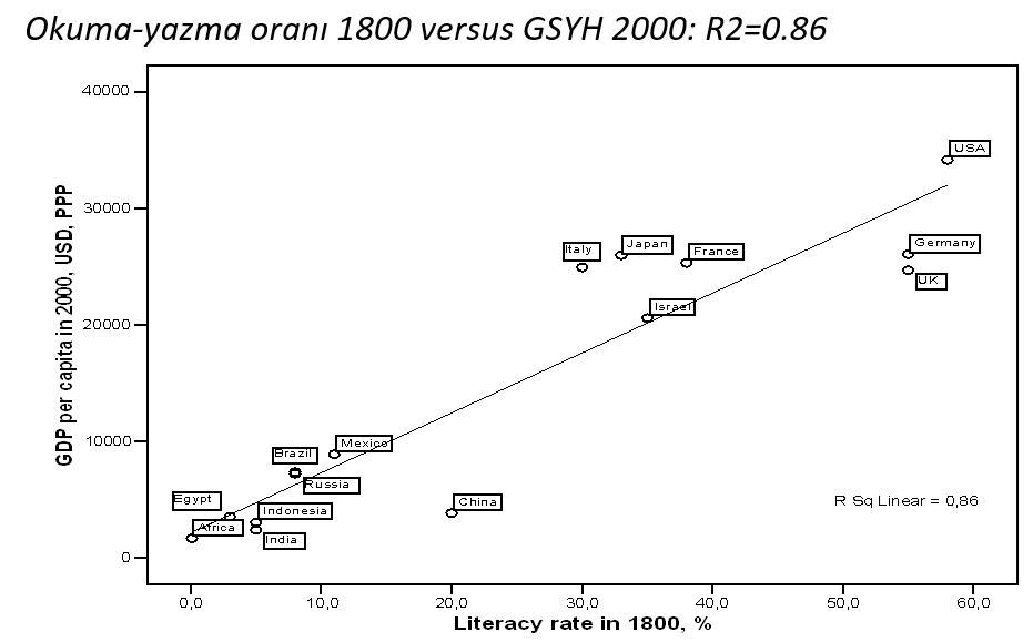 Aşağıda Korotayev, Malkov ve Khaltourina’nın yazdığı Introduction to Social Macrodynamics isimli kitabın 6. bölümünden alınan tablo yer alıyor. Veriler 2005 World Bank veri tabanından alınmış. 1800 yılındaki okuma-yazma oranları 2000 yılındaki fert başına gelir sıralamasıyla neredeyse birebir örtüşüyor. Fert başına gelir rakamlarıyla mukayesede 1800 yılında ülkeler arasında büyük farklar yok; ama eğitim seviyeleri farklı.