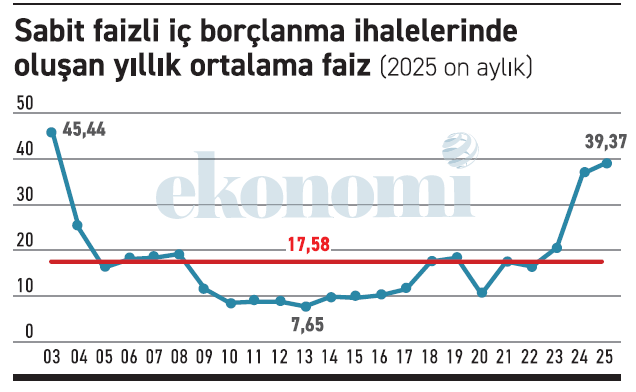 Bu yılın ilk on ayındaki ortalama faiz de yüzde 39,37 ile 2003’ten sonraki en yüksek faiz oldu. Yani Hazine’nin sabit faizli borçlanması 2003-2025 döneminde tam bir çanak eğrisi çizdi.