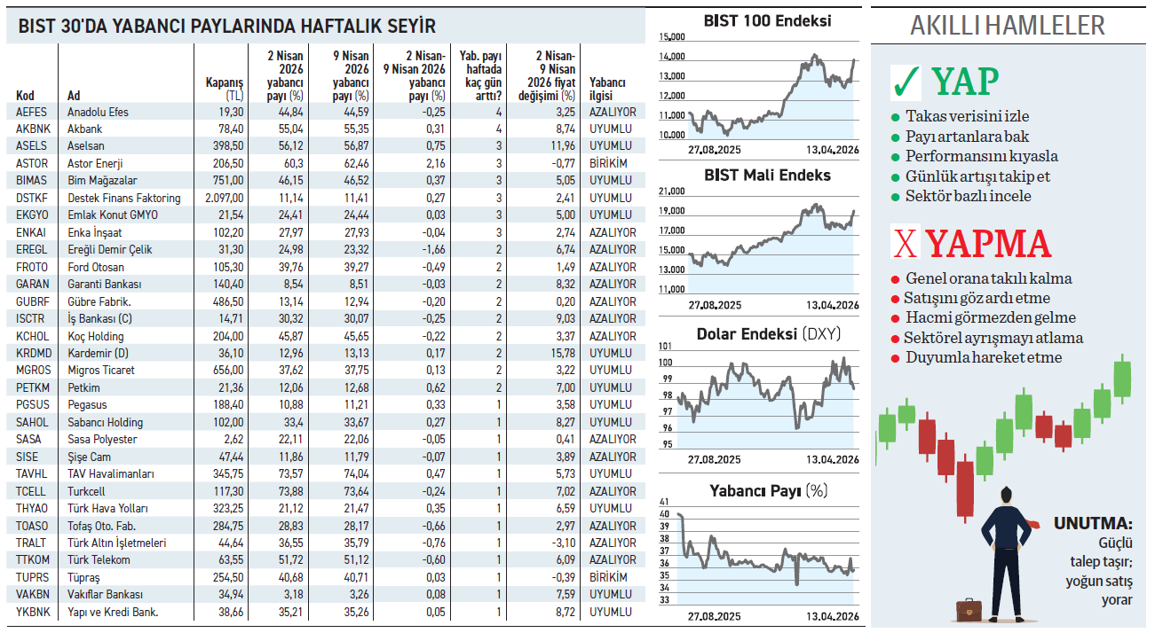 Borsanın %8,79 yükseldiği geçtiğimiz hafta, yabancıların payı 9 Nisan itibariyle %35,72’ye gerilese de BIST 30 hisselerinde satışları azaldı. Bir önceki hafta 22 hissede satış tarafındayken, geçtiğimiz hafta çıkışları 14 hissede kaldı. 16 hissede ise alım ağırlıklı işlemler yaptılar.