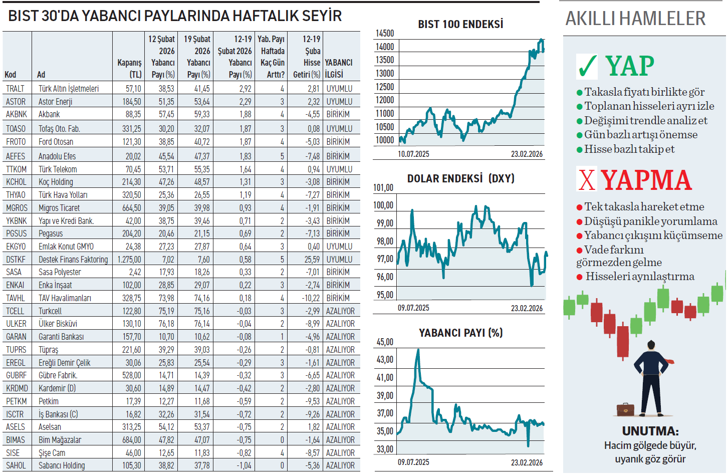 Takas verileri piyasada kör havuz mantığından ziyade seçici geçirgenliğin önde olduğunu işaret ediyor. Yabancılar endeksin genel yönüne bakmak yerine, şirketin hikayesine odaklanıyor. TRALT ve Astor gibi hisselere yönelimleri fiyatı yukarı yönlü desteklerken, TAV ve Ford hisselerindeki gibi fiyat gerilemelerini toplama fırsatı olarak değerlendirdiler. Öte yandan Tüpraş ve Garanti Bankası gibi büyüklerdeki belirgin satışları, piyasada paranın adres değiştirdiğini söylüyor. Yabancılar 12- 19 Şubat tarihleri arasında 5 gün boyunca düşük miktarlarda da olsa istikrarlı şekilde Destek Finans hissesinden aldı.