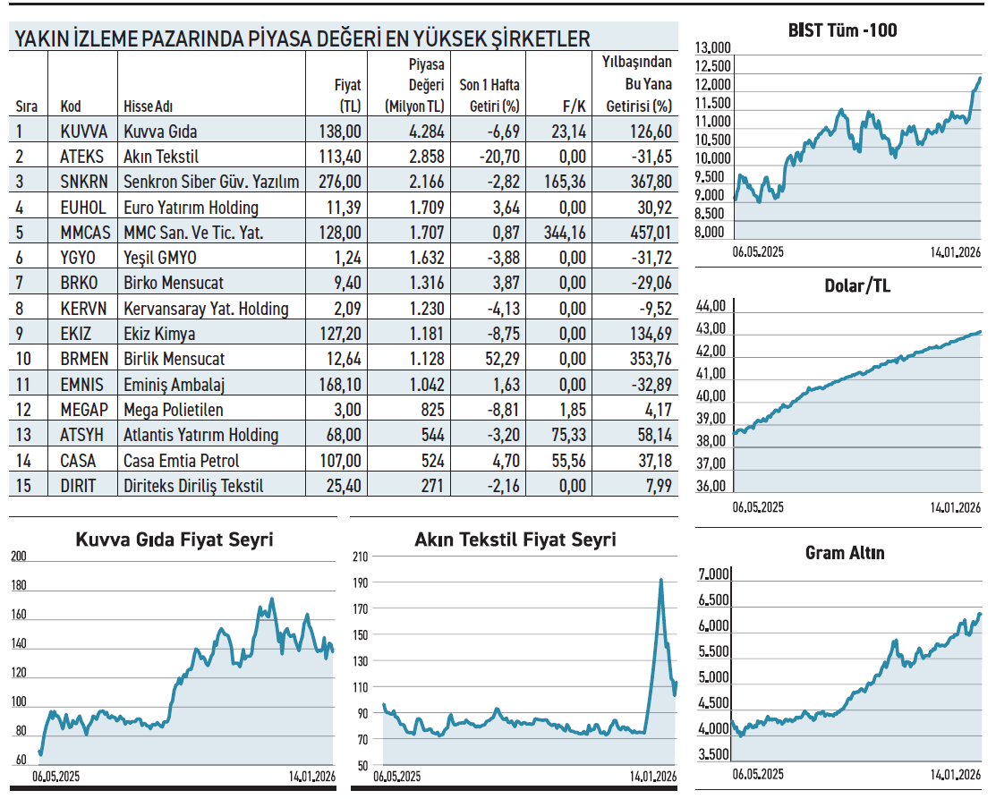 Kuvva Gıda, 4,28 milyar TL ile Yakın İzleme Pazarı’nın piyasa değeri en yüksek şirketi konumunda. Hisse son bir yılda %119’luk yükseliş kaydederken geçen bir haftadaki kaybı %2,82 seviyesinde gerçekleşti. Şirket dokuz aylık dönemde satışlarını %253 artırdı. Dönem sonunda 64,5 milyon TL ile zarardan kâra döndü.