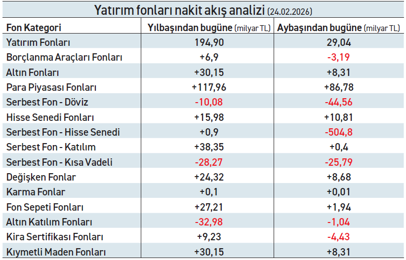 2025 yılının büyüklük lideri olan serbest döviz fonları, güncel tabloda ikinci sıraya gerilemiş durumda. Bu cephede uzun zamandır alışık olmadığımız bir küçülme dalgası hakim. Ay başından bugüne nette 44,56 milyar TL’lik bir çıkış gözlemleniyor. Döviz tarafındaki bu hafif çözülme, yurt içi yerleşiklerin TL faiz cazibesini kullanarak "carry trade" benzeri bir stratejiye yöneldiğinin en somut göstergesi.