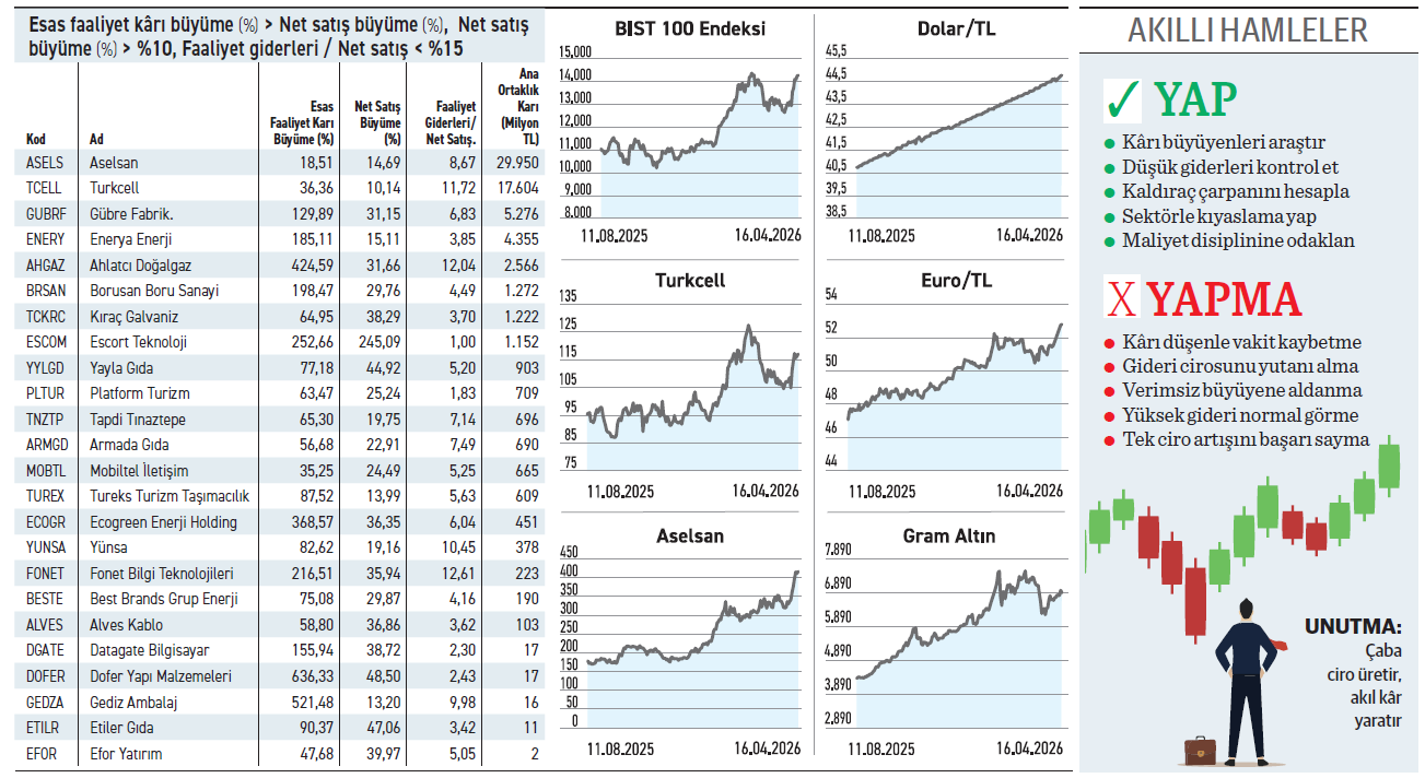 Borsada satışlarını %10’un üzerinde artırırken esas faaliyet kârını çok daha hızlı büyüten 24 şirket bulunuyor. Ciro ne kadar büyükse o kadar iyidir, ezberini bozan bu şirketlerin giderlerinin ciroya oranı %15 ve altında. Peki hepsi gerçekten de başarı hikayesi yazdı mı?
