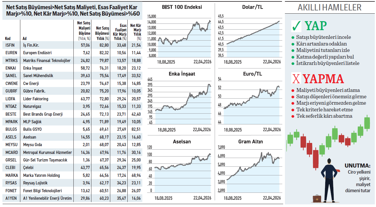 Borsada satışlarını %60’ın üzerinde artırırken hem esas faaliyet hem de net kâr marjını %10’un üzerinde tutmayı başaran 21 şirket bulunuyor. Bu firmalar, satış maliyetlerindeki artışı, ciro büyümesinin gerisinde tutarken aradaki makası doğrudan kâra dönüştürüyor.