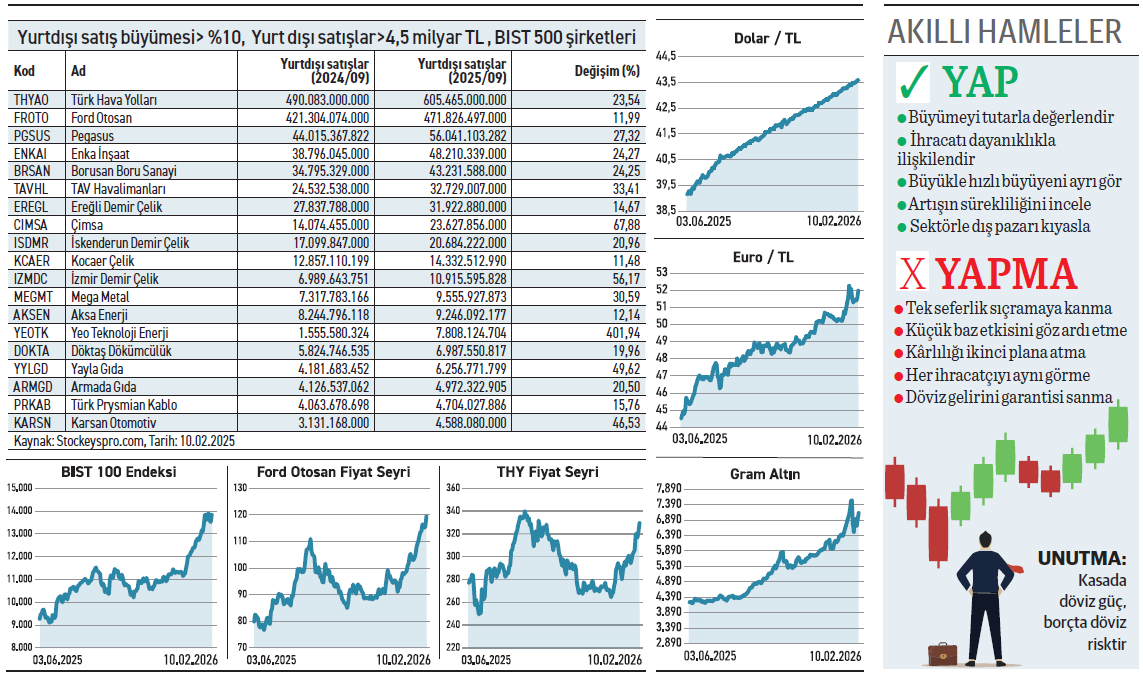 İç piyasadaki sıkışıklığa rağmen, yurt dışı satışlarını %10’un üzerinde artıran ve 4,5 milyar TL barajını aşan borsadaki 19 şirket dikkat çekiyor. Listenin tepesindeki THY, 605 milyar TL’lik yurt dışı geliriyle adeta ihracat devleti gibi duruyor.