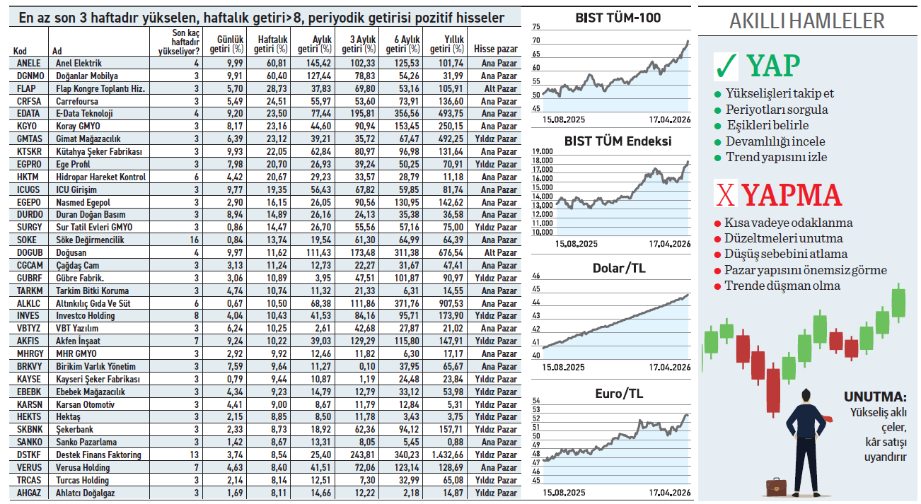 Piyasada çoğu yatırımcı ekrandaki o yemyeşil yükseliş serilerini gördüğünde çıkışın sonsuza dek süreceğine inanır. Oysa finansal fizikte, aracın tırmanış açısı dikleştikçe motorun hararet yapma ihtimali de artar. Listedeki kimi hisseler sınırı zorlanırken temel analizden kopan fiyatlar öne çıkıyor. Anel Elektrik ve Doğanlar Mobilya’nın gelirlerini bir gecede artıracak gelişme olmamasına rağmen %60’ın üzerinde prim yapması beklenti köpüğüne işaret ediyor. Rüzgarı arkasına alıp hayal kuranlar, bindiği dalganın nerede biteceğine de bakmayı ihmal etmemeli.