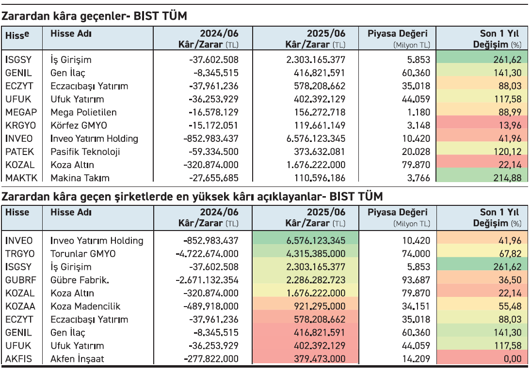 Şirketlerin zarardan kâra dönmesi, mali tablolarında önemli bir toparlanma ve iyileşme sinyali olarak değerlendirilir. Bu dönüşüm, yatırımcıların güvenini artırarak hisseye olan ilgiyi canlandırabilmektedir. Bu nedenle zarardan kâra dönen firmalar yakından takip edilir. Borsada işlem gören 48 şirket yılın ilk yarısında zarardan kâra geçmeyi başardı.
