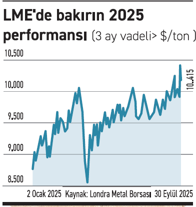 Bakır vadeli işlemleri ABD’de dün pound başına 4,85 dolar, yani ton başına 10.645 dolar seviyesine çıktı. Eylül ayında bakır yüzde 6,7 değer kazandı ve üst üste ikinci aylık yükselişini kaydetti. Londra Metal Borsası’nda (LME) fiyatlar ton başına 10.415 dolarla yılın en yüksek düzeyini gördü.