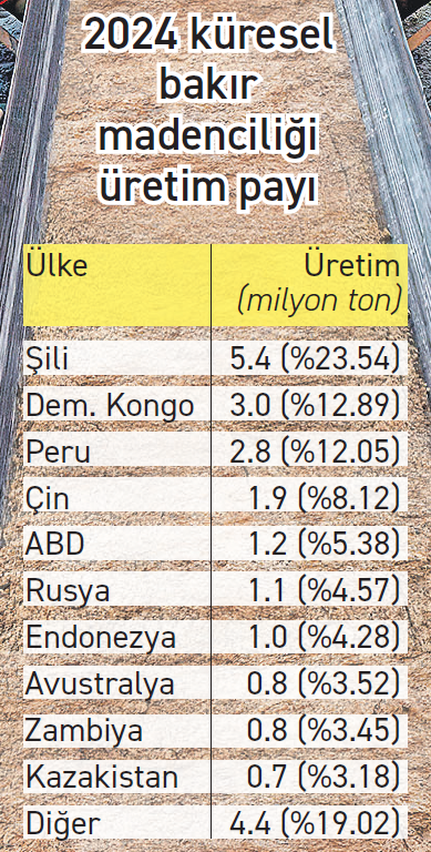 Küresel bakır piyasası giderek küçük bir grup mega madene bağımlı hale geliyor; bu da tedarik zincirini daha kırılgan yapıyor. 2024 itibarıyla küresel bakır üretiminin yaklaşık yarısı yalnızca üç ülkenin elinde: Şili yüzde 23,5, Demokratik Kongo Cumhuriyeti yüzde 12,9 ve Peru yüzde 12 paya sahip. Bu yoğunlaşma, arz güvenliği tartışmalarında Güney Amerika ve Afrika’nın kritik rolünü öne çıkarıyor. Çin’in yüzde 8,1’lik payı üretimde ilk üçe giremese de, ülkenin rafinaj kapasitesi ve tüketimdeki ağırlığı düşünüldüğünde küresel fi yatlar üzerinde etkisi çok daha büyük. ABD’nin yüzde 5,3, Rusya’nın yüzde 4,6, Endonezya’nın yüzde 4,3 ve Avustralya’nın yüzde 3,5’lik payları, ikinci ligde rekabeti belirliyor. Zambiya ve Kazakistan gibi ülkeler de yüzde 3 civarındaki üretimleriyle bölgesel denge unsuru konumunda. Küresel üretimin yüzde 19’unu temsil eden “diğer ülkeler” grubu ise çeşitliliğe rağmen dağınık yapısıyla etkisiz kalıyor.
