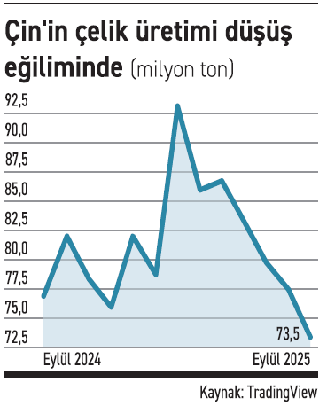 Dünyanın en büyük çelik üreticisi olan Çin, 2024’te 1 milyar tonun üzerinde üretim gerçekleştirmişti. Ancak gayrimenkul yatırımlarındaki durgunluk ve zayıf sanayi talebi bu tabloyu tersine çevirdi. Çin Demir Çelik Birliği’ne göre 2025’te çelik tüketimi yüzde 5,7, ham çelik üretimi yüzde 2,9 azaldı. Başkan Yardımcısı Jiang Wei, tüketimin üst üste beşinci yılda da gerileyeceğini belirtti. Eylül 2025’te Çin’in çelik üretimi geçen yılın aynı dönemine göre yüzde 4,6 düşerek 73,5 milyon tona geriledi; bu, üst üste dördüncü aylık azalış. Aylık bazda da yüzde 5’lik düşüş kaydedildi. Toplam üretim Ocak–Eylül döneminde 746 milyon tona inerek yıllık bazda yüzde 2,9 geriledi. Uzmanlara göre bu eğilim, tatil sezonu ve zayıf piyasa talebinin birleşik etkisinden kaynaklanıyor.