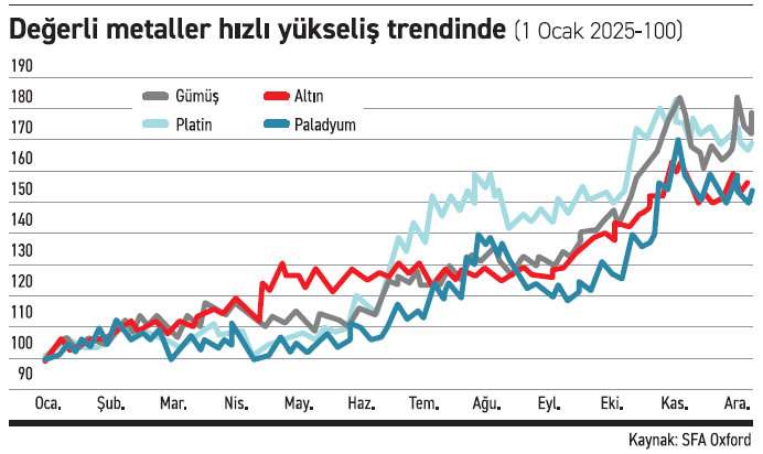 Gümüş cephesinde tablo daha da çarpıcı. Ons fiyat dün 69 doların üzerine çıkarak yeni bir rekor kıran gri metal, yıl içinde yüzde 133’ün üzerinde prim yaptı. Jeopolitik riskler, zayıflayan dolar ve finansal piyasalardaki belirsizlik, gümüşü hem güvenli liman hem de spekülatif bir araç haline getirdi. Platin ise rallideki yerini aldı ve fiyat ons başına 2.125 dolara çıkarak 2008’den bu yana en yüksek seviyelerini test etti. Arzın sınırlı kalması ve yatırımcıların alternatif kıymetli metallere yönelmesi, platini yeniden radarın merkezine taşıdı. Yılbaşından bu yana platin getirisi yüzde 130’a yaklaştı.