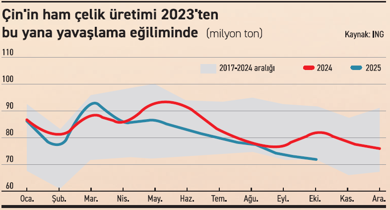 Ancak bu yeni yatırım bileşimi, geçmişteki inşaat odaklı büyüme dönemlerine kıyasla çok daha düşük çelik yoğunluğu gerektiriyor. Bu nedenle altyapı harcamaları, geleneksel talep kanallarındaki zayıflığı telafi etmeye yetmiyor. Çin Ulusal İstatistik Bürosu’nun imalat PMI verisi Kasım ayında sınırlı bir yükseliş gösterse de, endeks sekizinci ay üst üste daralma bölgesinde kaldı.