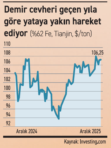 Çin’de yüzde 62 tenörlü demir cevheri fiyatları son bir yılda sınırlı bir artış göstererek 106– 108 dolar bandında dengelendi. Yüzde 2,5 civarındaki bu yataya yakın performans, piyasanın zaten daha zayıf bir talep ortamını fiyatlamaya başladığını gösteriyor. Uzmanlara göre, geleneksel büyüme motorlarından gelen talebin aşınması ve deniz yoluyla arzın artması, demir cevheri piyasasını 2026’ya daha kırılgan bir zeminle taşıyacak.
