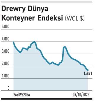 ABD Başkanı Donald Trump’ın ticarette yarattığı türbülansın etkisiyle daralma eğilimine giren Drewry Dünya Konteyner Endeksi (WCI), eylül ayı sonunda 2.000 doların altına inerek psikolojik bir kırılma yaşamıştı. Beklentilere paralel olarak düşüşün hızlandığı endeks, bu hafta da 40’lık konteyner başına, 1.650 dolar seviyesine indi. Böylece endeks Ocak 2024’ten bu yana en düşük seviyeye geriledi. Sadece ABD-Çin rotasında değil, Uzak Doğu– Avrupa hattında da navlun benzer oranlarda geriledi.