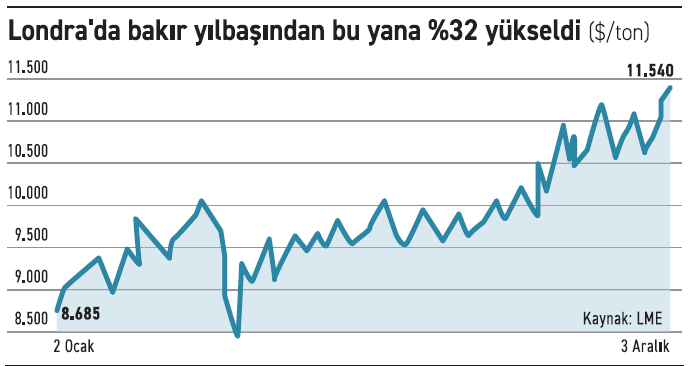 Şanghay’da bakır vadeli işlemleri dün ton başına 91.400 yuanla (12.600 dolar) tüm zamanların zirvesine çıktı. Londra’da üç aylık bakır sözleşmesi 11.540 dolar ile rekor tazeledi. LME’nin Güney Kore ve Tayvan’daki varant stoklarını iptal etmesinin ardından görünür stokların 105.275 tonla Temmuz’dan bu yana en düşük seviyeye gerilemesi ralliyi daha da körükledi.
