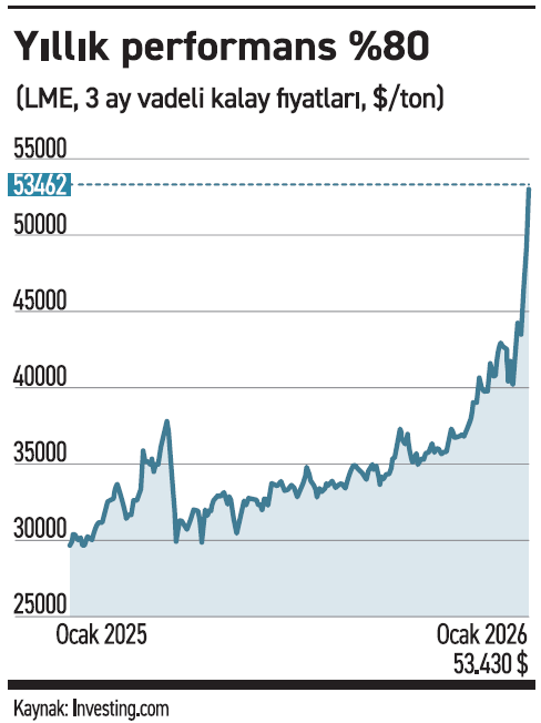 Baz metaller içinde bu yılın açık ara en güçlü performansını sergileyen kalay, fiyatlamada tarihi bir eşiği aşarak yeni bir döneme girdi. Londra Metal Borsası’nda (LME) kalay vadeli işlemleri bu hafta ton başına 50.000 dolar seviyesinin üzerine tırmandı. Bu bariyer aşıldıktan sonra ivmesini daha da artıran fiyatlar 53.400 doların üzerine çıkarak tüm zamanların en yüksek seviyesini gördü. Uzmanlara göre kısa vadede 58 bin dolar hedeflenebilir.