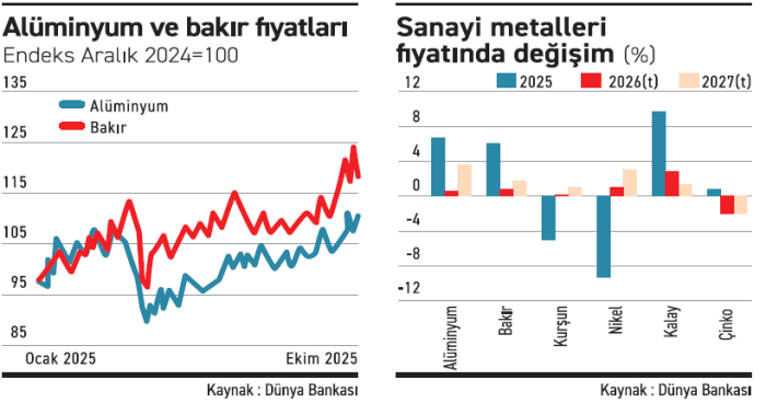2025’i yüzde 7’lik artışla kapatması bekleniyor. ABD’nin yıl içinde uygulamaya koyduğu gümrük vergilerine rağmen ekim itibarıyla fiyatlarda toparlanma gözlendi. Çin’in karbon emisyonlarını sınırlamak amacıyla uyguladığı üretim tavanı, Avrupa’da enerji krizinin ardından devre dışı kalan tesislerin sınırlı şekilde devreye alınmasıyla birleşince arz büyümesi kısıtlı kaldı. Yenilenebilir enerji altyapısı, rüzgâr türbinleri ve iletim hatlarında kritik rolüyle alüminyum orta vadede güçlü bir konumda bulunuyor. Banka, fiyatların 2026’da yüzde 1, 2027’de ise yüzde 4 artmasını bekliyor.