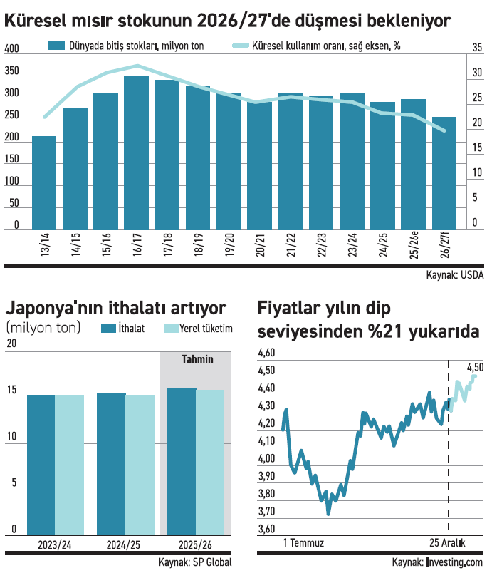 Piyasanın asıl daralmasının 2026/27 sezonunda yaşanacağı öngörülüyor. Mevcut projeksiyonlar, küresel arz açığının yaklaşık 39 milyon tona ulaşacağını ve stokların 260 milyon tonun altına gerileyeceğini gösteriyor. Stok-kullanım oranının yüzde 20’ye düşmesi, mısır fiyatları açısından daha destekleyici bir zemin oluşturabilir.