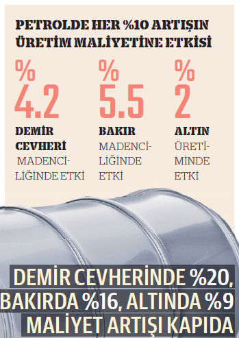 ● Analistlerin senaryosuna göre ham petrol fiyatının, 2025 yılının yüzde 47 üzerinde olan varil başına ortalama 100 dolar civarında seyretmesi durumunda madencilik maliyetlerinde belirgin bir artış yaşanabilir.