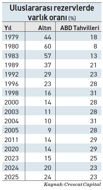 Bretton Woods sisteminin sona ermesinin ardından, hızla yükselen reel faiz oranları rezerv yöneticilerini 1980’lerin sonu ve 1990’lar boyunca ABD Hazine tahvillerine yönlendirdi. 2000’li yıllarda doların varlığı daha güçlendi. Ancak 2022’den bu yana, resmi altın alımları yeniden hız kazandı.