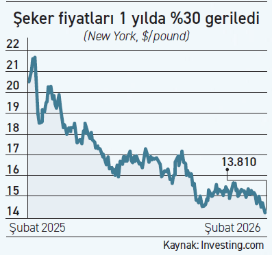 New York’taki ham şeker vadeli işlemleri dün pound başına 14 sentin altına düşerek Ekim 2020’den bu yana en düşük seviyesi olan 13.82 sente indi. Son 1 haftada yüzde 4, yılbaşından bu yana yüzde 8 gerileyen fiyatlar 2023 sonlarında ulaştığı 28 sent seviyesinin yarısının bile altına geriledi.
