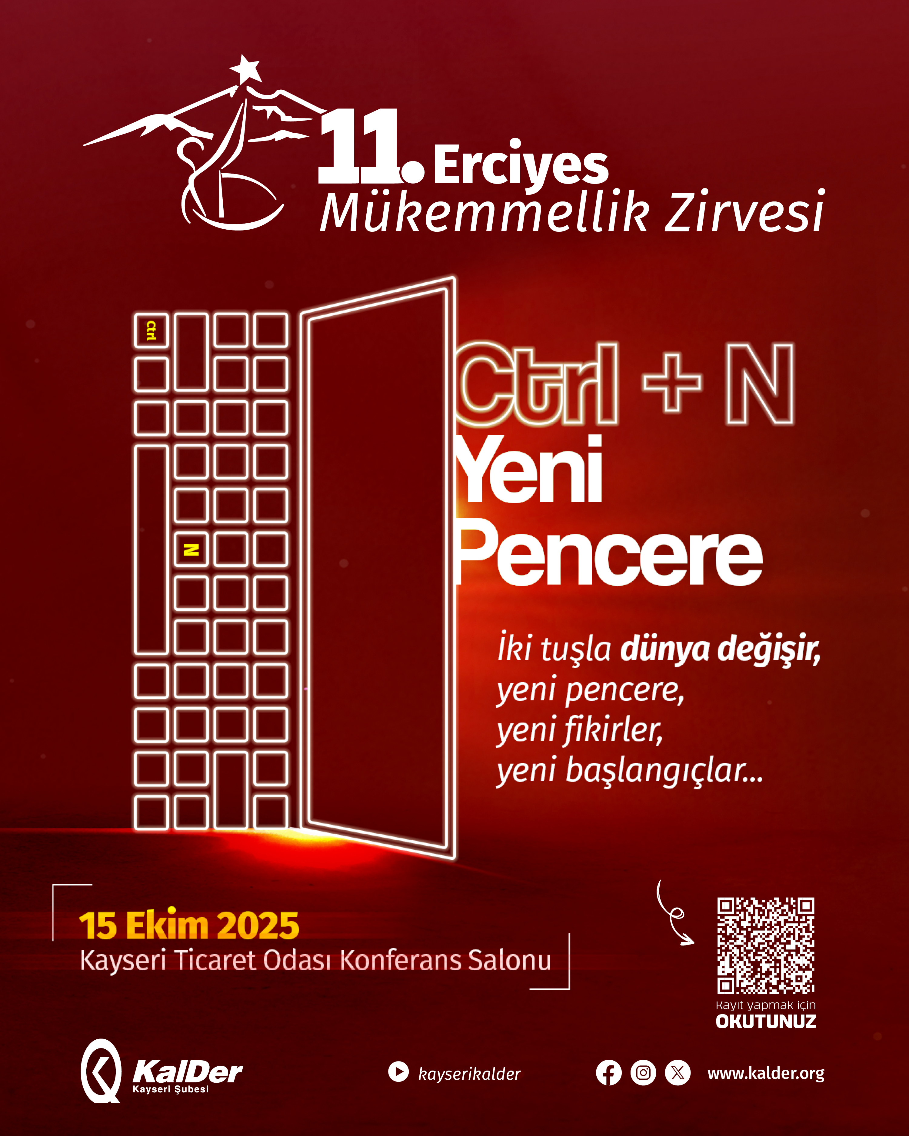 Türkiye Kalite Derneği (KalDer) Kayseri Şubesi 15 Ekim Çarşamba günü Kayseri Ticaret Odası (KTO) Konferans Salonu’nda “CTRL + N Yeni Pencere” mottosuyla 11. Erciyes Mükemmellik Zirvesi’ni düzenleyecek.