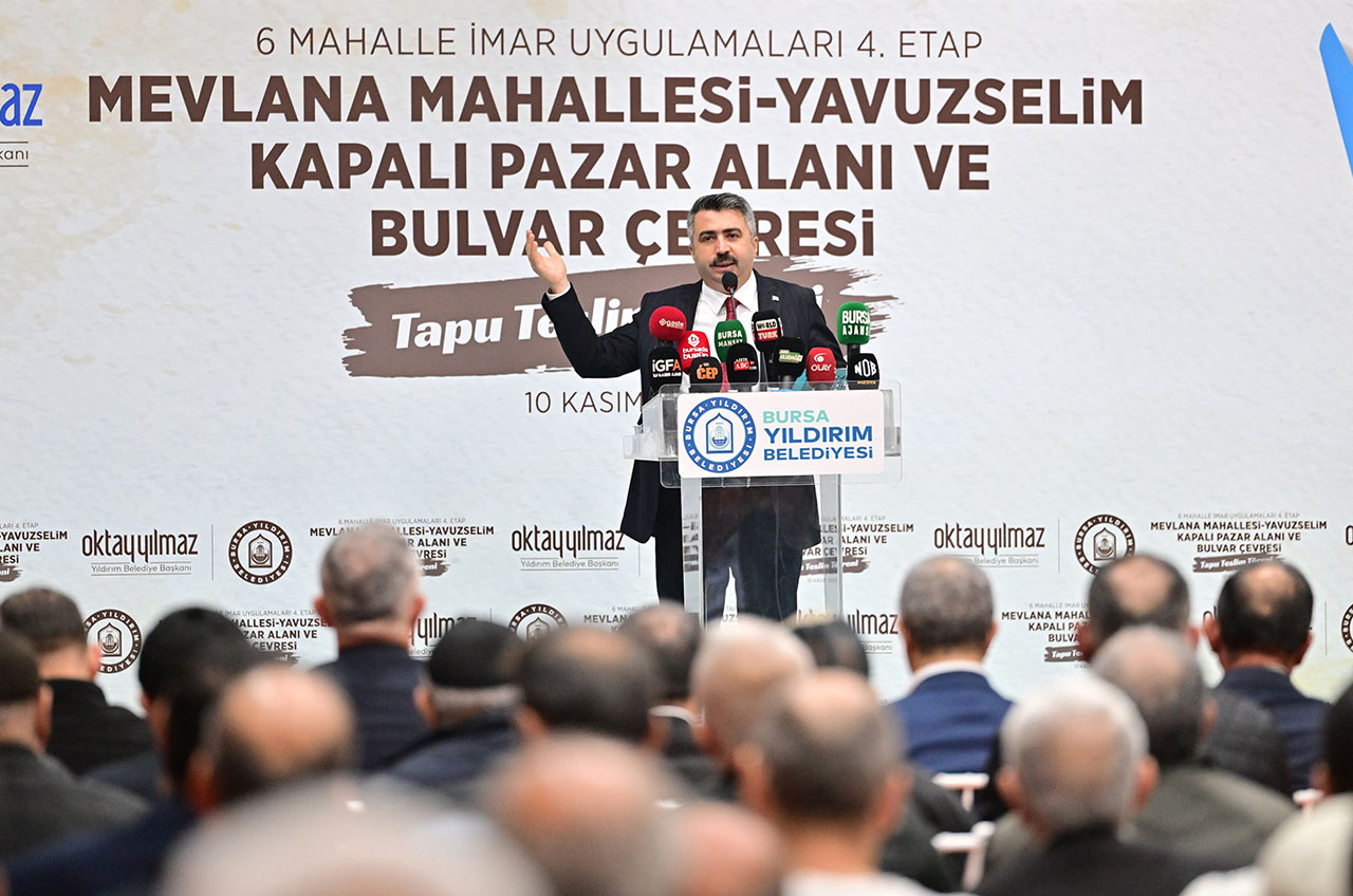Arabayatağı, Çınarönü, Ulus, Yavuzselim, Mevlana ve Hacivat mahallelerini içerisine alan 300 hektarlık alanda uzun yıllardır devam eden imar ve mülkiyet düzenlemelerine kararlılıkla sahip çıktıklarını vurgulayan Yıldırım Belediye Başkanı Oktay Yılmaz, “Çalışmalarımızı 4 etap hâlinde planladık. 1. etapta 251, 2. etapta 4 bin 166, 4. etap kapsamında bin 550 olmak üzere, toplam 5 bin 867 hak sahibinin tapusunu teslim ettik. 3.Etapta ise imar uygulamalarını tamamladık. Bu 18 bin 950 tapunun Tapu Tescil Müdürlüğü’nde tescil edilmesinin ardından kısa süre içerisinde dağıtımını gerçekleştireceğiz. Böylece, 24 bin 817 dönüşüm tapusu üretmiş olacağız. Bu, Yıldırım'ın geleceğini değiştiren büyük bir adımdır.” dedi.