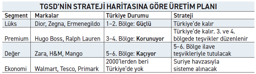 Raporda sektörün küresel pazarda dört ana segmentte değerlendirildiği belirtiliyor: lüks, premium, değer ve ekonomi. Buna göre lüks ve premium üretimin Türkiye’de kalması, değer segmentinin 5. ve 6. bölgelere yönelik yeni teşviklerle korunması, ekonomi segmentinin ise sınır üretim havzası modeliyle yeniden Türk üretim ekosistemine kazandırılması planlanıyor. TGSD’ye göre Türkiye’nin son yıllarda kaybettiği en büyük alan, yüksek hacimli ekonomi segmenti oldu. Bugün değer segmentinde de benzer kayıp riski bulunuyor. Yeni modelle Türkiye, küresel alıcılara tüm segmentlerde farklı maliyet ve hizmet seçenekleri sunabilen entegre bir tedarik merkezi haline gelebilecek.
