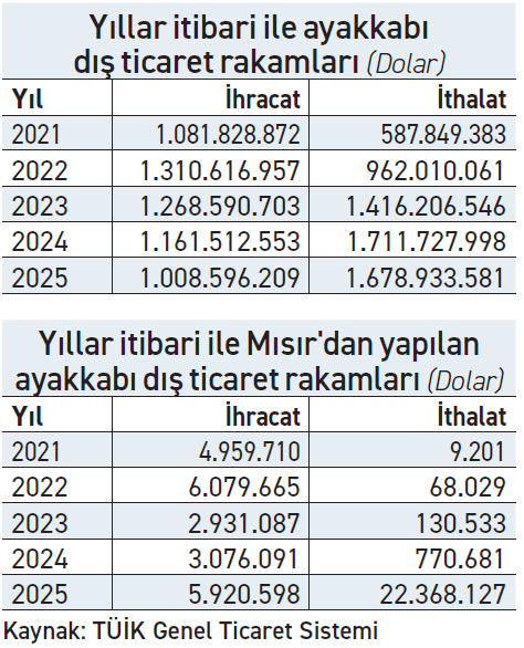 Önümüzdeki dönemde en büyük riskin Mısır olacağını vurgulayan İçten, “Bir önceki yıl sıfıra yakın olan Mısır’dan yapılan ithalat, geçen yıl 22 milyon doları aştı. Bu rakam ilk bakışta çok yüksek görünmeyebilir ancak bu değerle Mısır, ayakkabı ithalatı yaptığımız ülkeler arasında ilk 10’a girdi. Artış eğilimi devam ediyor. Orada adeta bir yapı kurulmuş durumda. Çin’den getirilen saya ve tabanlar Mısır’da monte edilerek, Serbest Ticaret Anlaşması’nın etkisiyle sıfır vergiyle Türkiye’ye giriyor. Çinli firmalar Mısır’a yatırım yaptı. Çin yeni yılının ardından, 7 Şubat-3 Mart 2026 döneminde üretimin başlaması bekleniyor. Bu şekilde devam ederse yakın zamanda 100 milyon dolar seviyelerinin görüleceğini tahmin ediyorum. Bu ciddi bir tehdit” dedi.