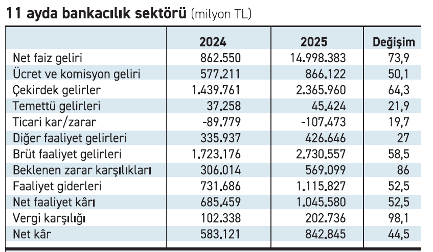 Bankacılık Düzenleme ve Denetleme Kurumu (BDDK) aylık verilerine göre dördüncü çeyrekte bankacılık sektörünün net karı aylık ortalamada çeyreksel bazda yüzde 5 arttı. Operasyonel gelirlerin yüzde 5 arttığı kasım ayında azalan net karşılık giderleri ise analistlere göre net karı destekledi. Bankacıların hesaplamalarına göre kredi mevduat makası Kasım 2025 döneminde 11 baz puan azalırken net faiz marjı artan menkul kıymet getirileri neticesinde 37 baz puan genişleyerek yüzde 5,9 oldu.